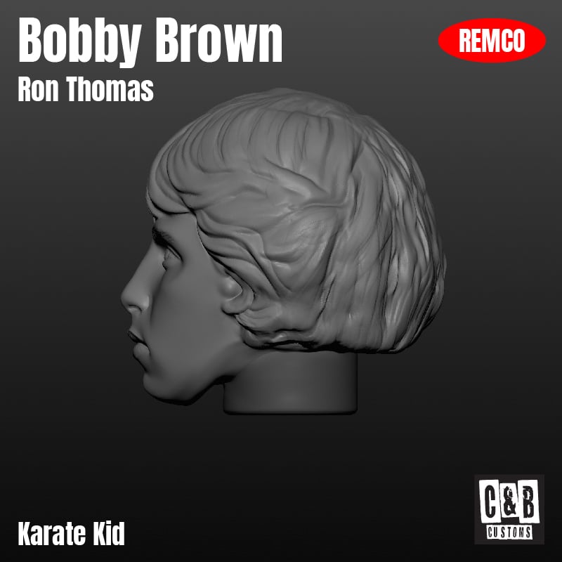 3D resin printed head in the likeness of Bobby Brown from the hit movie The Karate Kid. Designed with the head size and necks for both Remco and Diamond Select scale figures.
