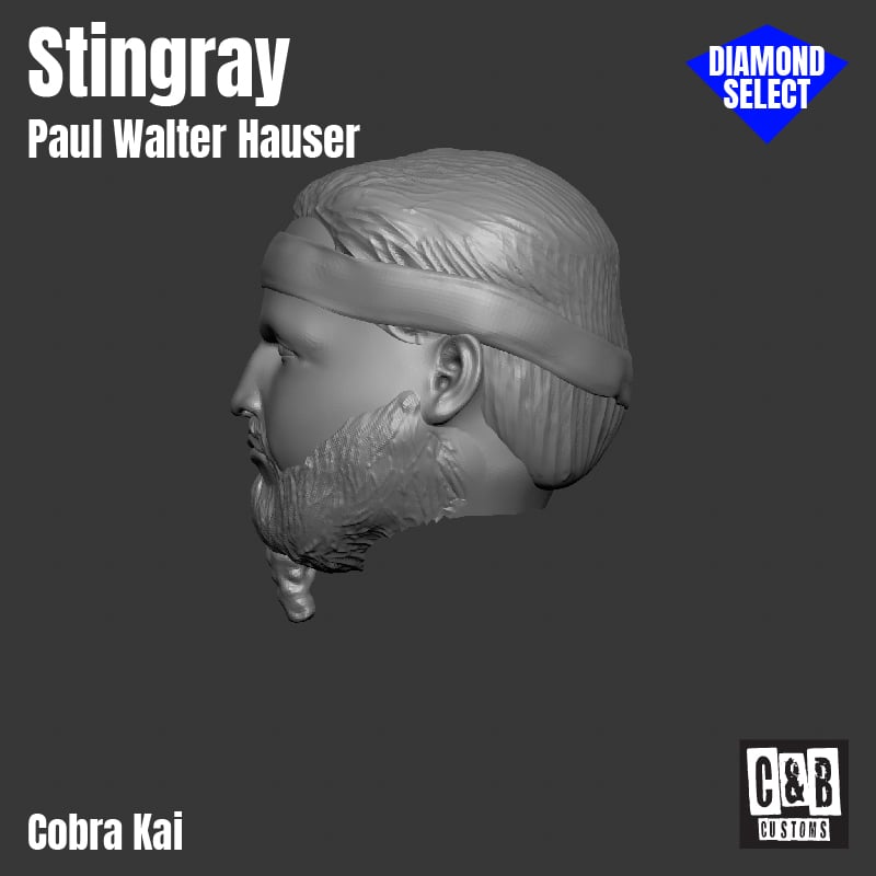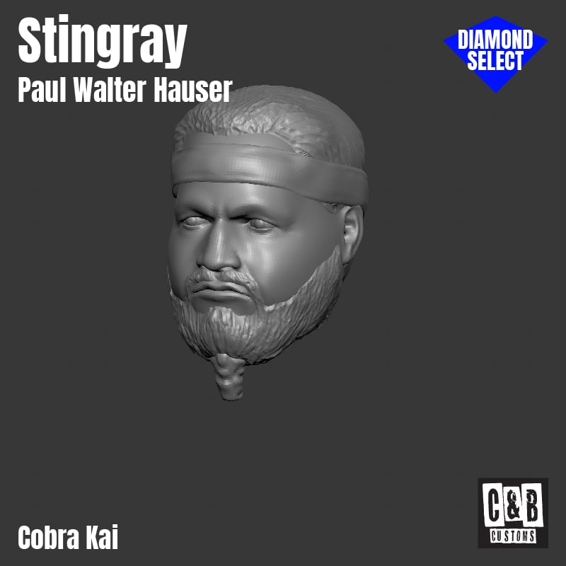 3D resin printed head in the likeness of Stingray from the hit TV show Cobra Kai. Designed with the head size and necks for both Remco and Diamond Select scale figures.