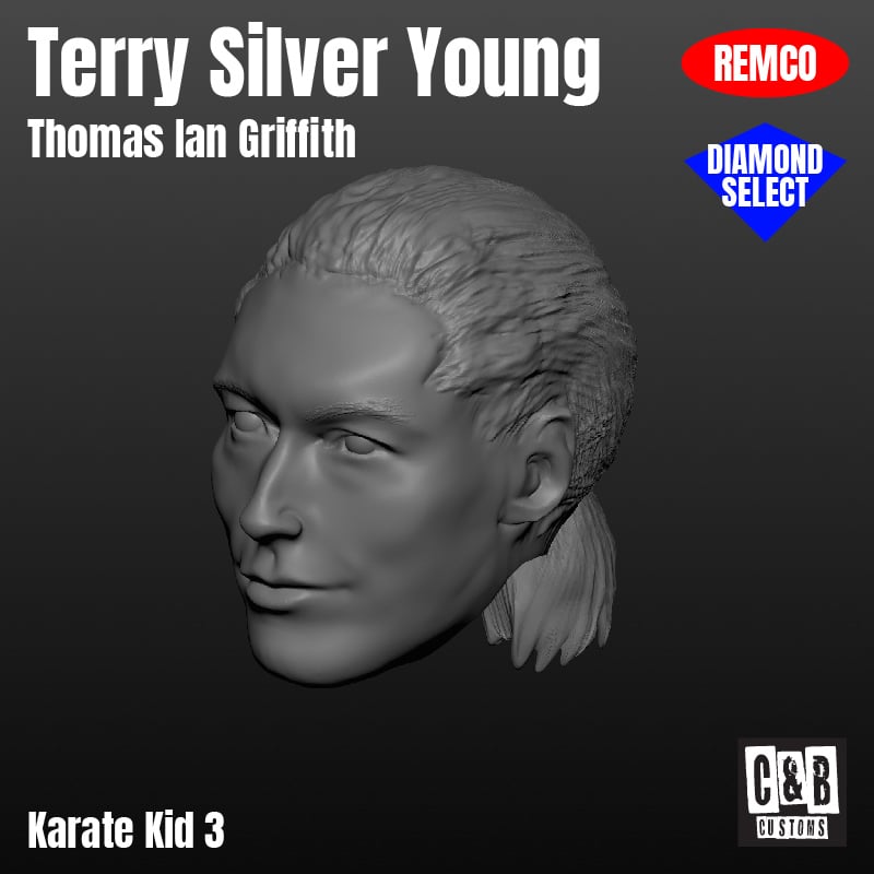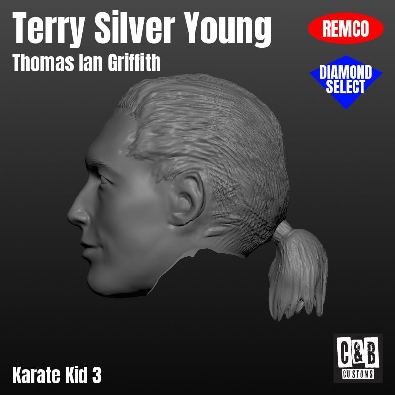 3D resin printed head in the likeness of Terry Silver Young Version from the TV show Cobra Kai. Designed with the head size and necks for both Remco and Diamond Select scale figures.